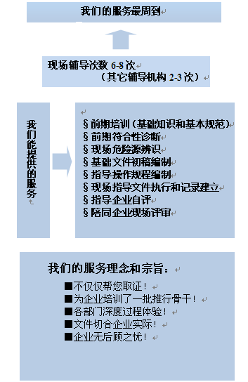公司與多家安全標(biāo)準(zhǔn)化標(biāo)評審機構(gòu)建立合作關(guān)系,有二十余位安標(biāo)技術(shù)輔導(dǎo)老師,參加由福建省安科院組織的安全生產(chǎn)標(biāo)準(zhǔn)化評審員培訓(xùn)并通過考試,取得評審員資格,安全標(biāo)準(zhǔn)化實戰(zhàn)經(jīng)驗豐富。